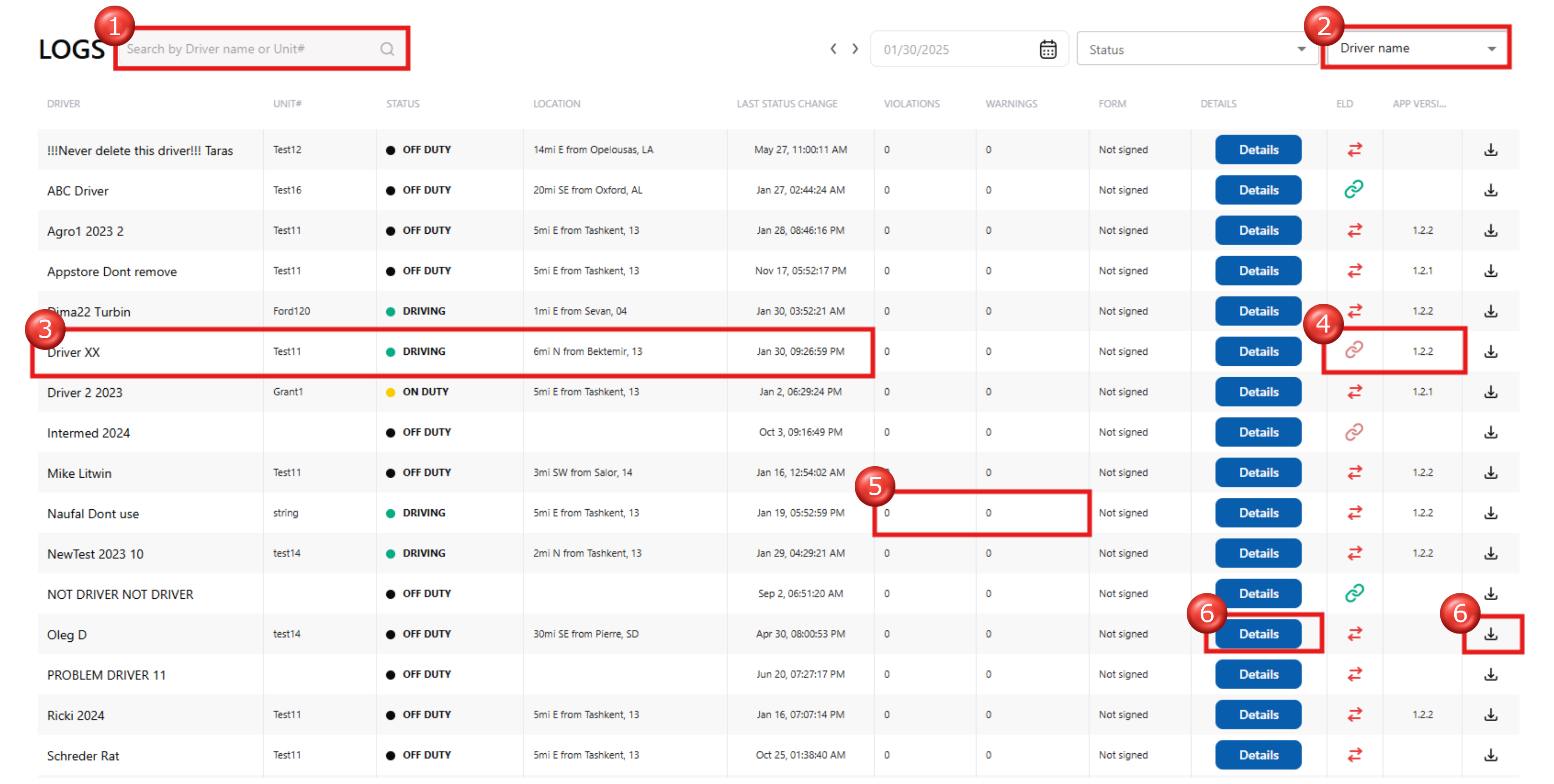 - See driver's name, current status, mobile app version, smartphone OS (Android/iOS), ELD type, and connection status