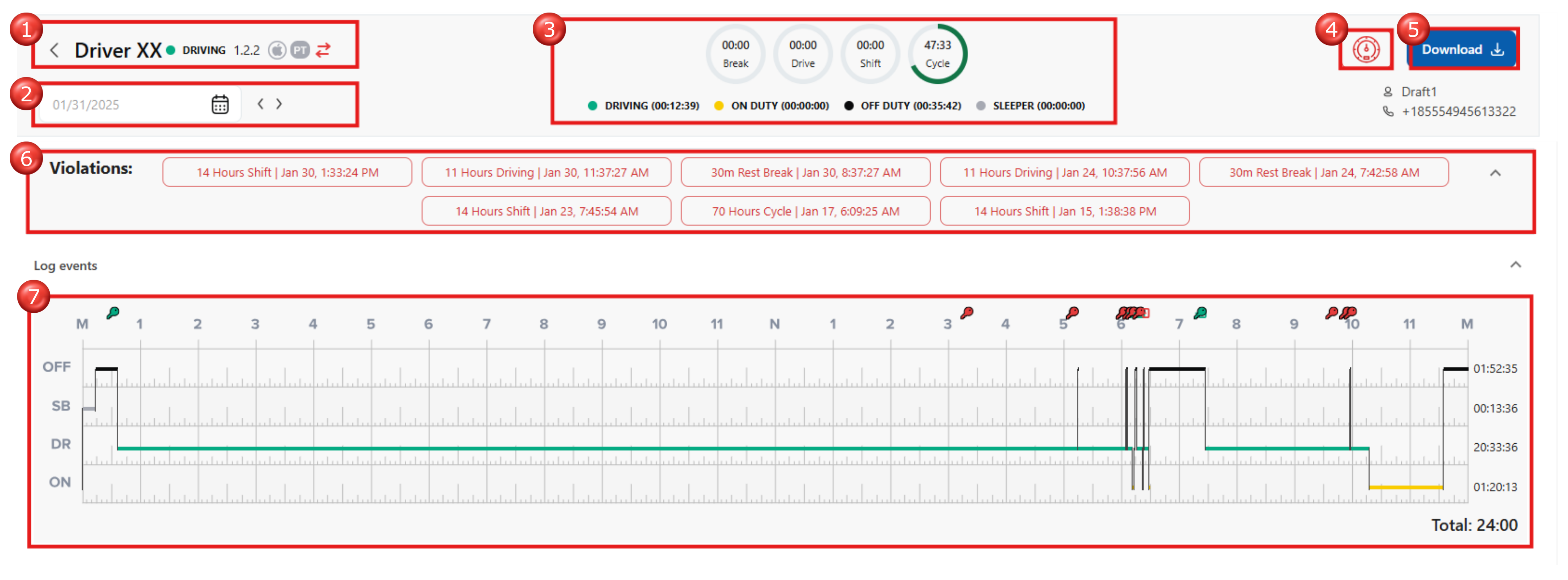 This section displays a summary of the driver's worked/rest hours based on selected log entries.- Categories: OFF DUTY, SLEEPER, DRIVING, ON DUTY, RECAP