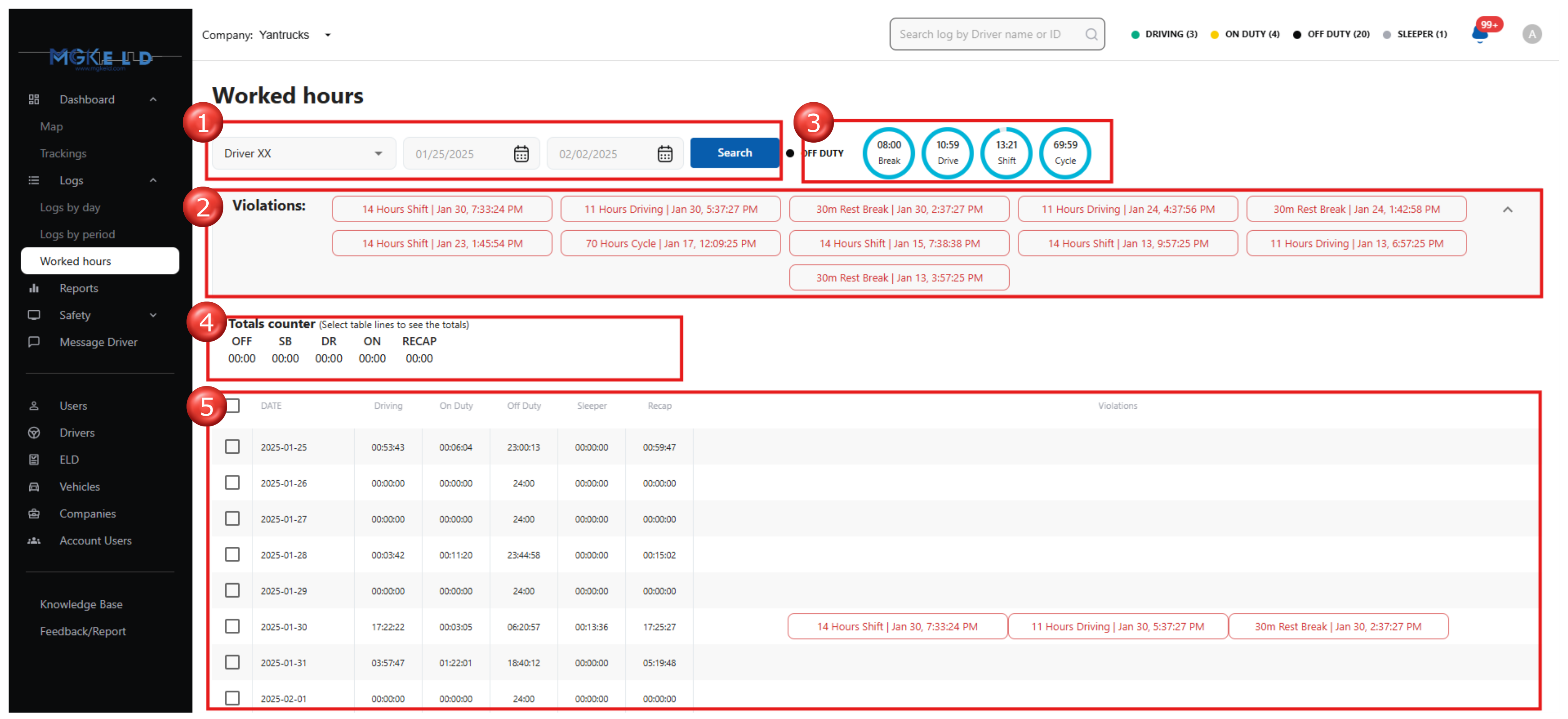 The Worked Hours page provides a comprehensive breakdown of driver work hours, rest periods, and compliance with Hours of Service (HOS) regulations. It includes live timers, violation alerts, and total worked/rest hours for easy tracking.