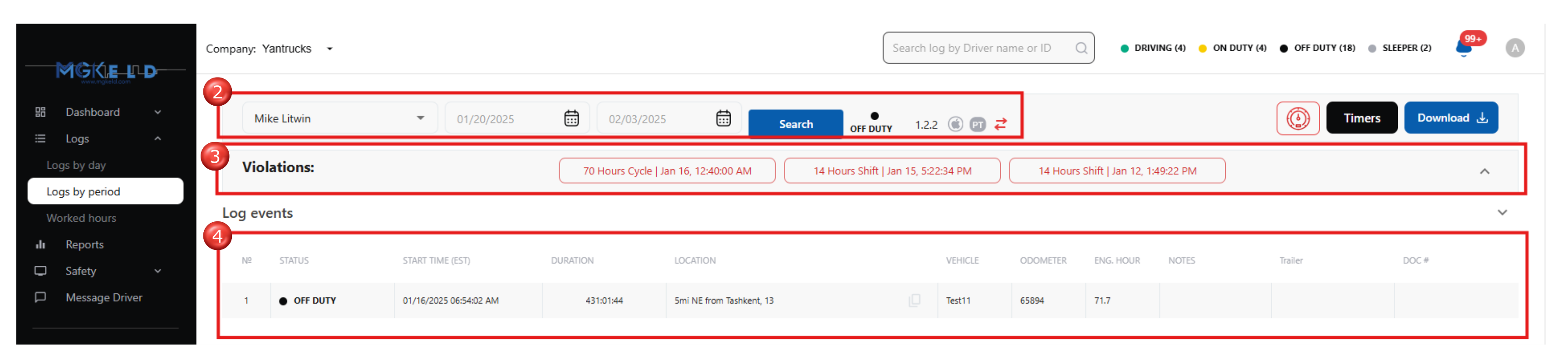 The Logs by Period page provides an overview of driver logs for a selected time range. This page helps fleet managers track driver activity, identify potential violations, and download log reports.