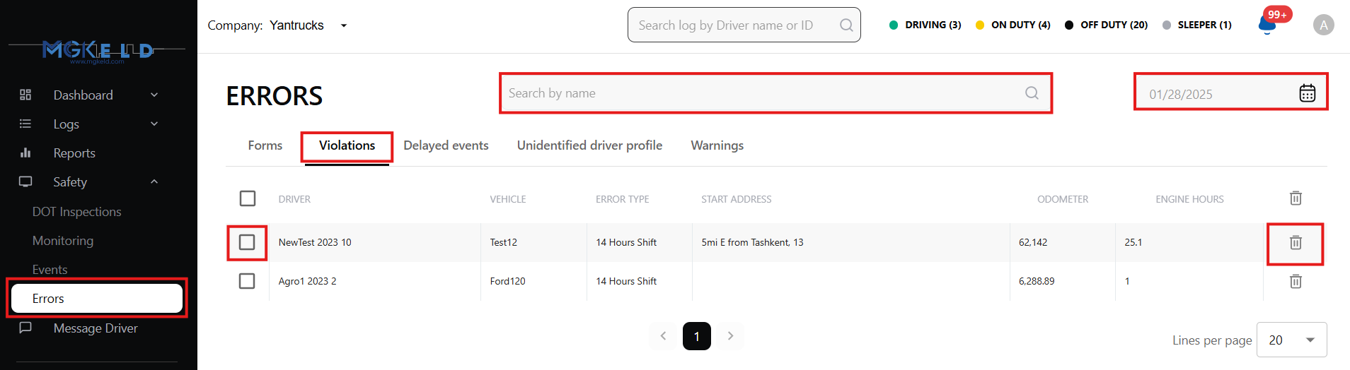 - Displays all detected violations for company drivers on a selected date.