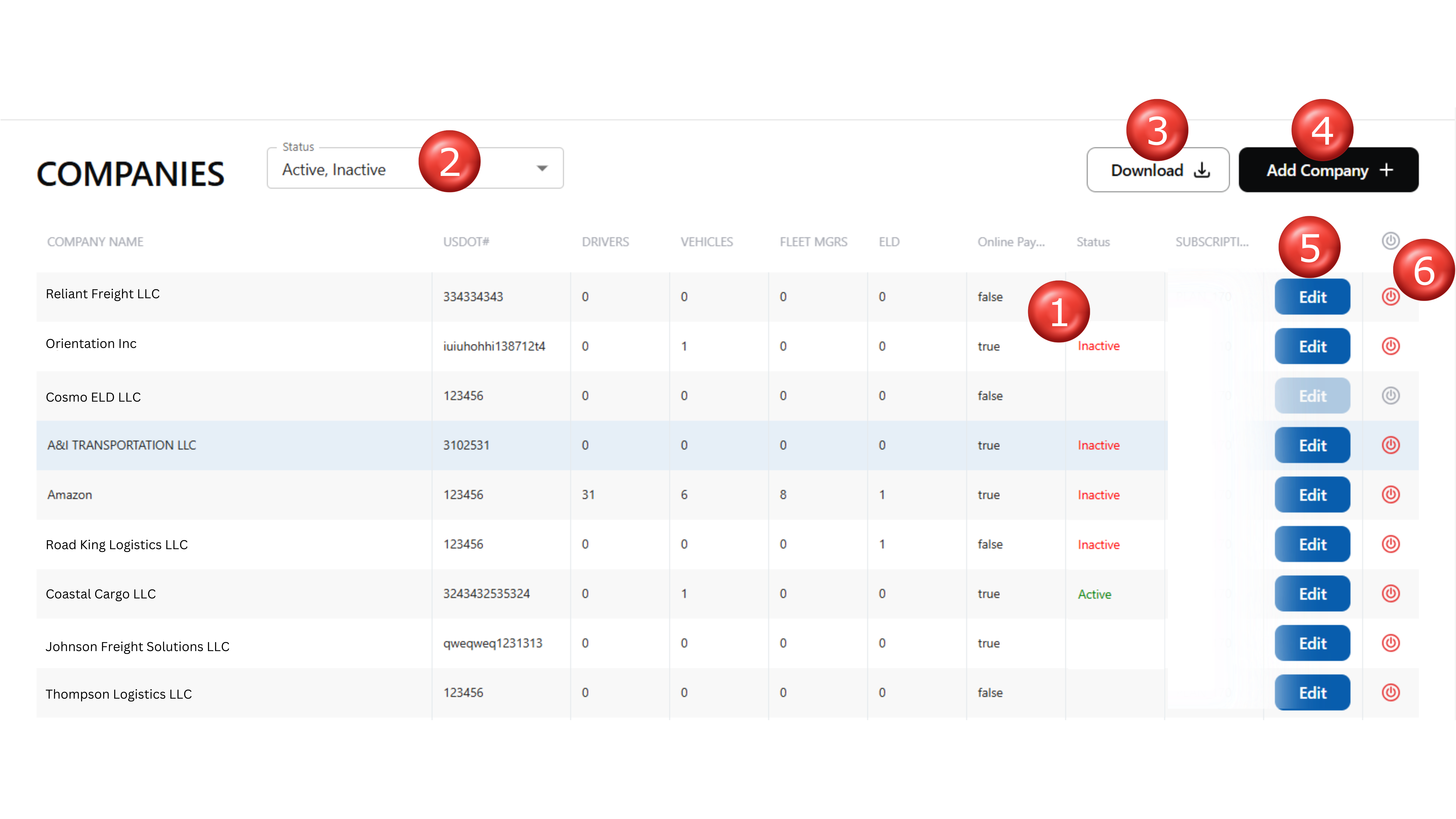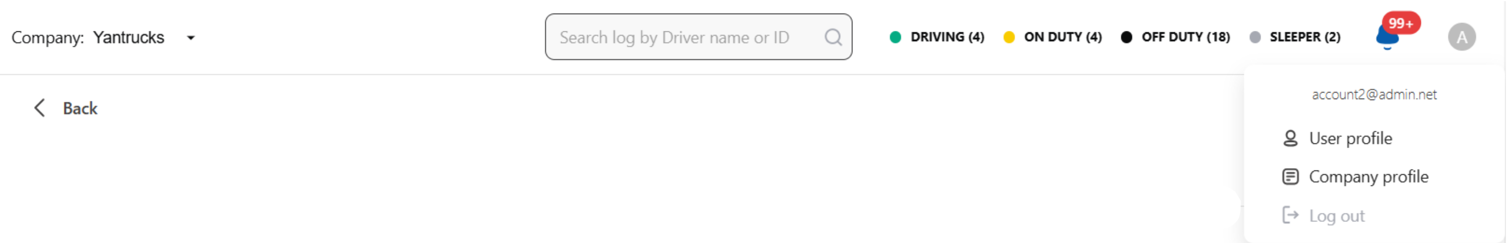 NOTE: There should be at least one company created the access to other pages of the menu like Users, Vehicles, Drivers, ELD - Create vehicles and drivers.