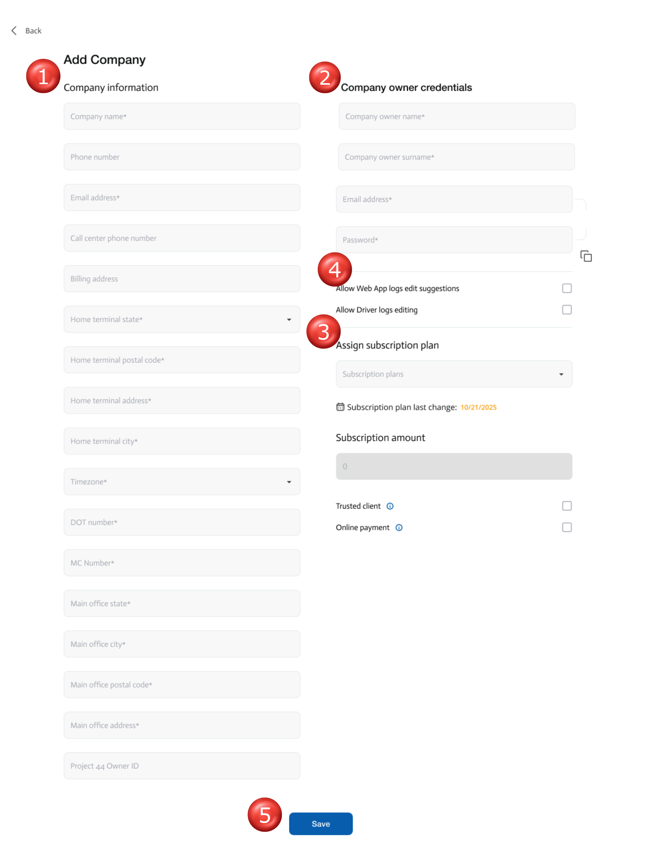 The "Add Company" page allows Account Admins to create a new company or edit an existing one by pressing to Edit button of the company under interest from Companies page. This section provides all necessary fields to input company information, assign credentials to the company owner, and configure subscription details.